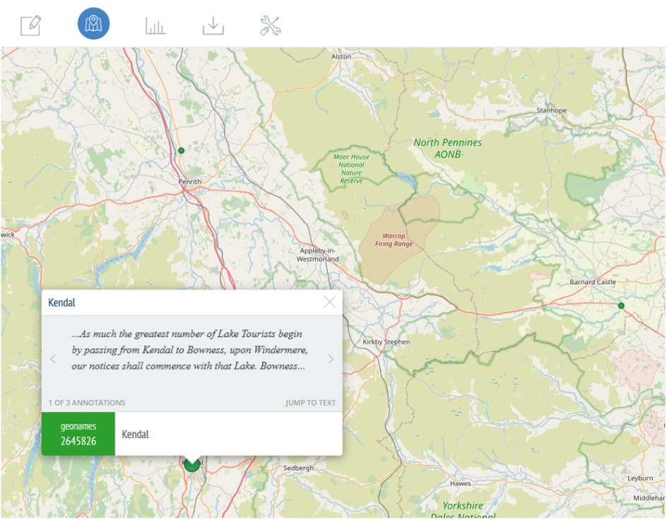 • Now that we have annotated a few places, click on the Map View at the top of the screen. You will be able to see that all three places now appear on our map. Furthermore, because Kendal appears three times in our text, it appears as a slightly larger ‘dot’ on our map to reflect its frequency in the text.