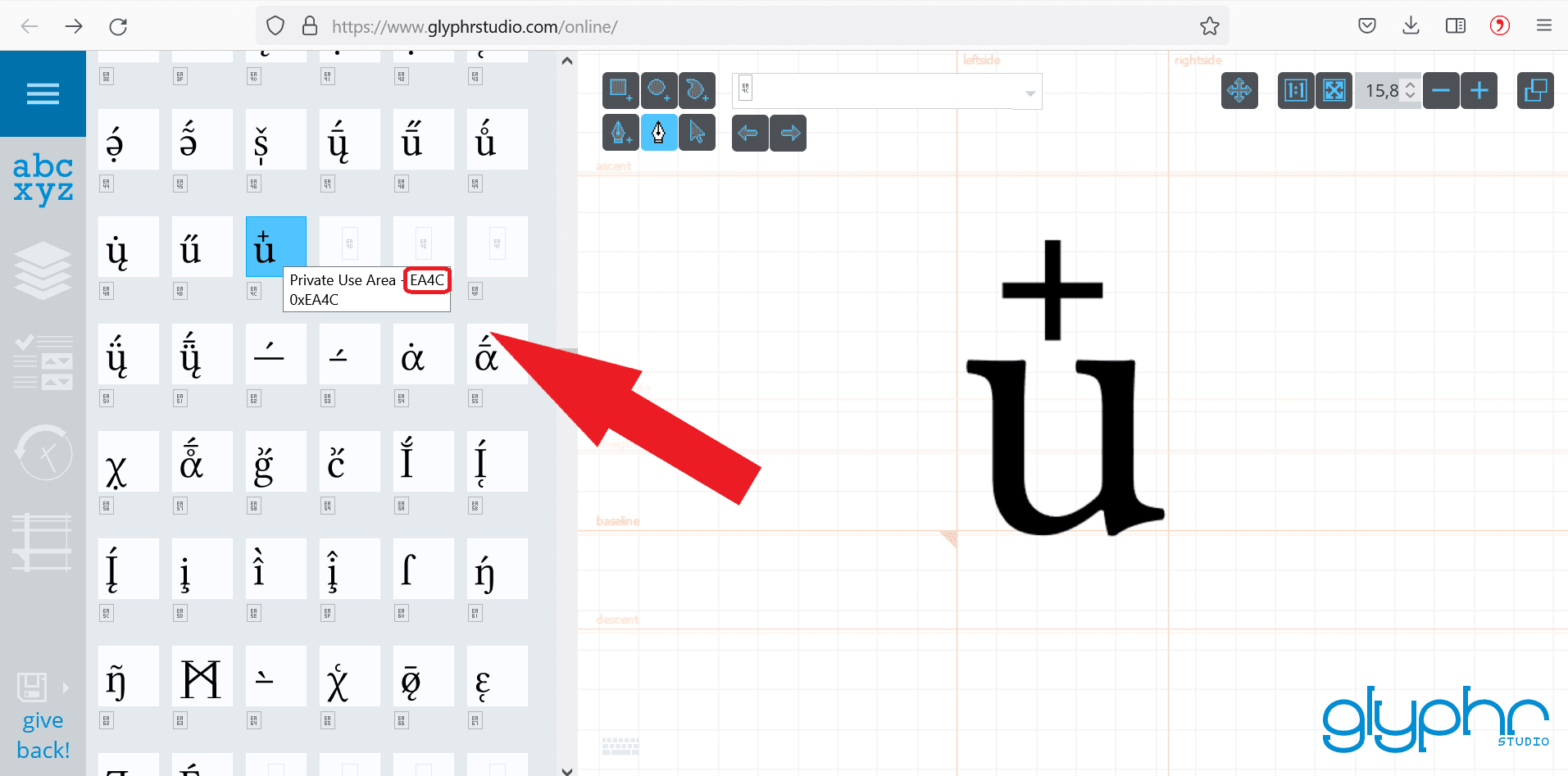 1. When you have found your desired character in the overview, find out its position. To do this, move the mouse over the character. The position is displayed in a mouseover after the string “Private Use Area”. In the following example it is “EA4C”.