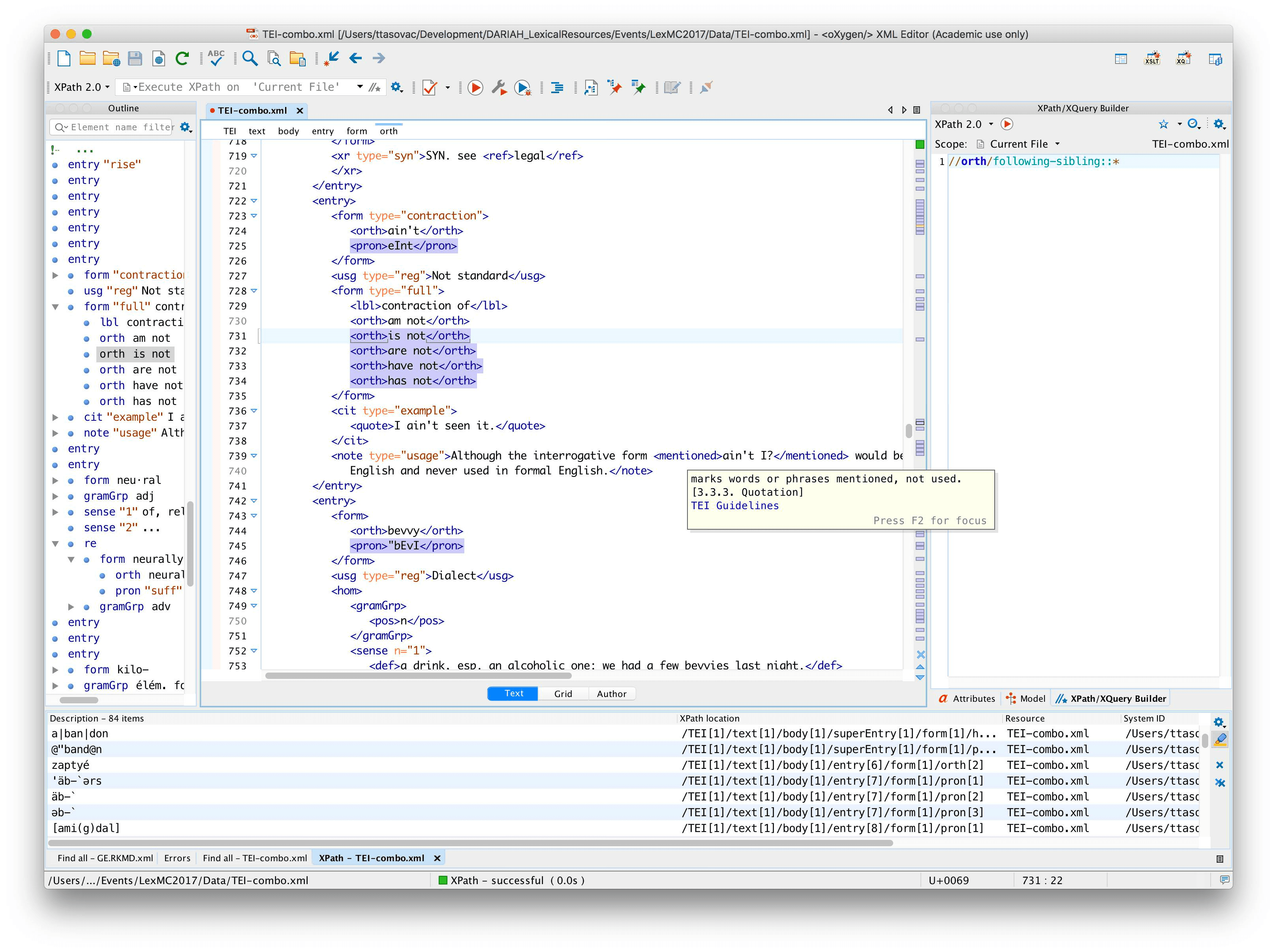 In this tutorial, you will learn how to write XPath expressions in order to navigate around our XML-encoded dictionaries and select only those bits of data that you are interested in.